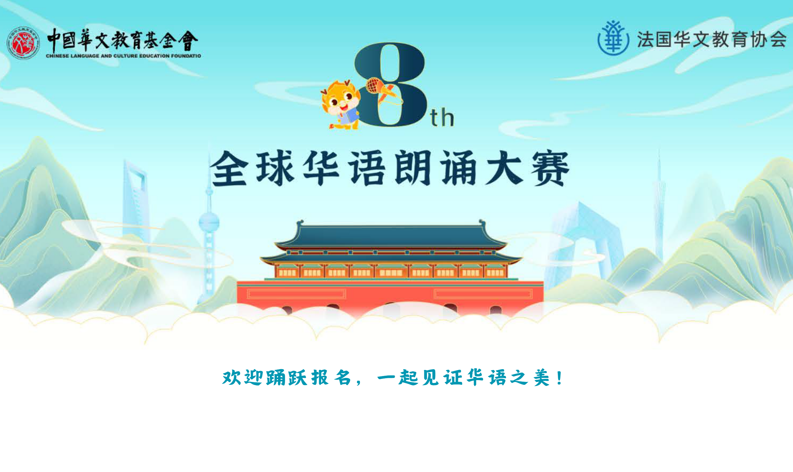 第八届全球华语朗诵大赛是由中国华文教育基金会主办的全球性青少年语言艺术赛事,旨在提升海外华裔青少年的中文表达能力与文化认同感。欧洲时报文化中心中文学校连续三年组织学员参赛,累计培养近千名朗诵新秀,曾获得数次全球总决赛个人金奖。法国华文教育协会(秘书处设在欧洲时报文化中心)荣获上届朗诵大赛“优秀组织奖”。