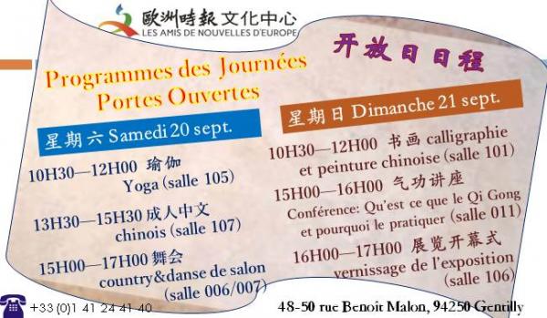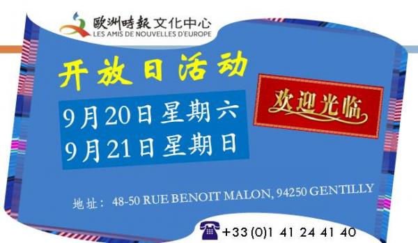 为了让更多的人了解和关注我们,欧洲时报文化中心将在2014年9月20、21日(周六、周日)举办开放日活动,届时将有公共课程:瑜伽、书画、成人中文,以及气功讲座、舞会和展览等各项活动。诚邀广大学生、家长及中法各界人士来中心咨询参观、指导。