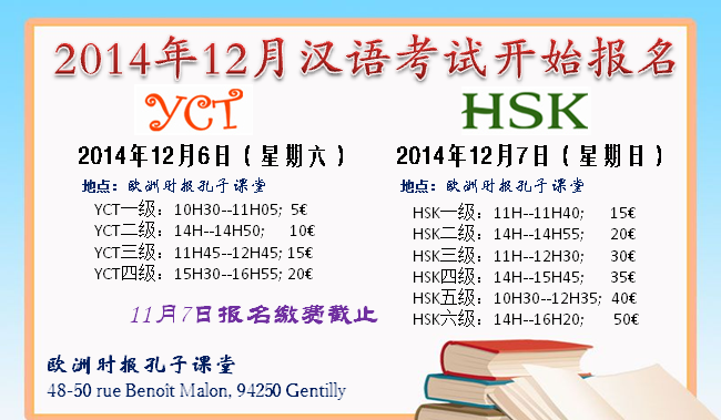 欧洲时报孔子课堂定于2014年12月6日(星期六)举行新中小学生汉语考试(YCT),12月7日(星期日)举行新汉语水平考试(HSK)。