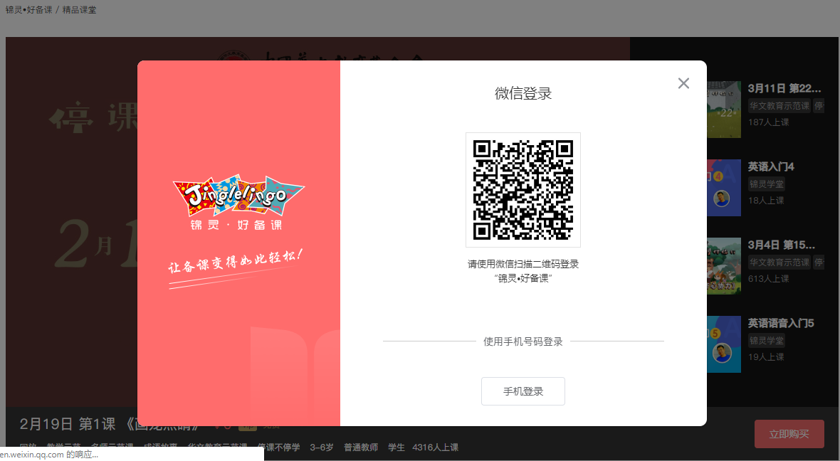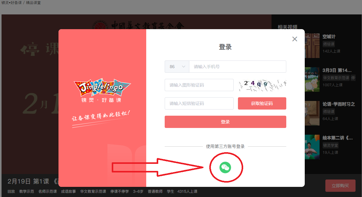 2.点击播放,出现对话框,要求登录。可选“手机”或“微信”登录方式。如选择“微信”登录。