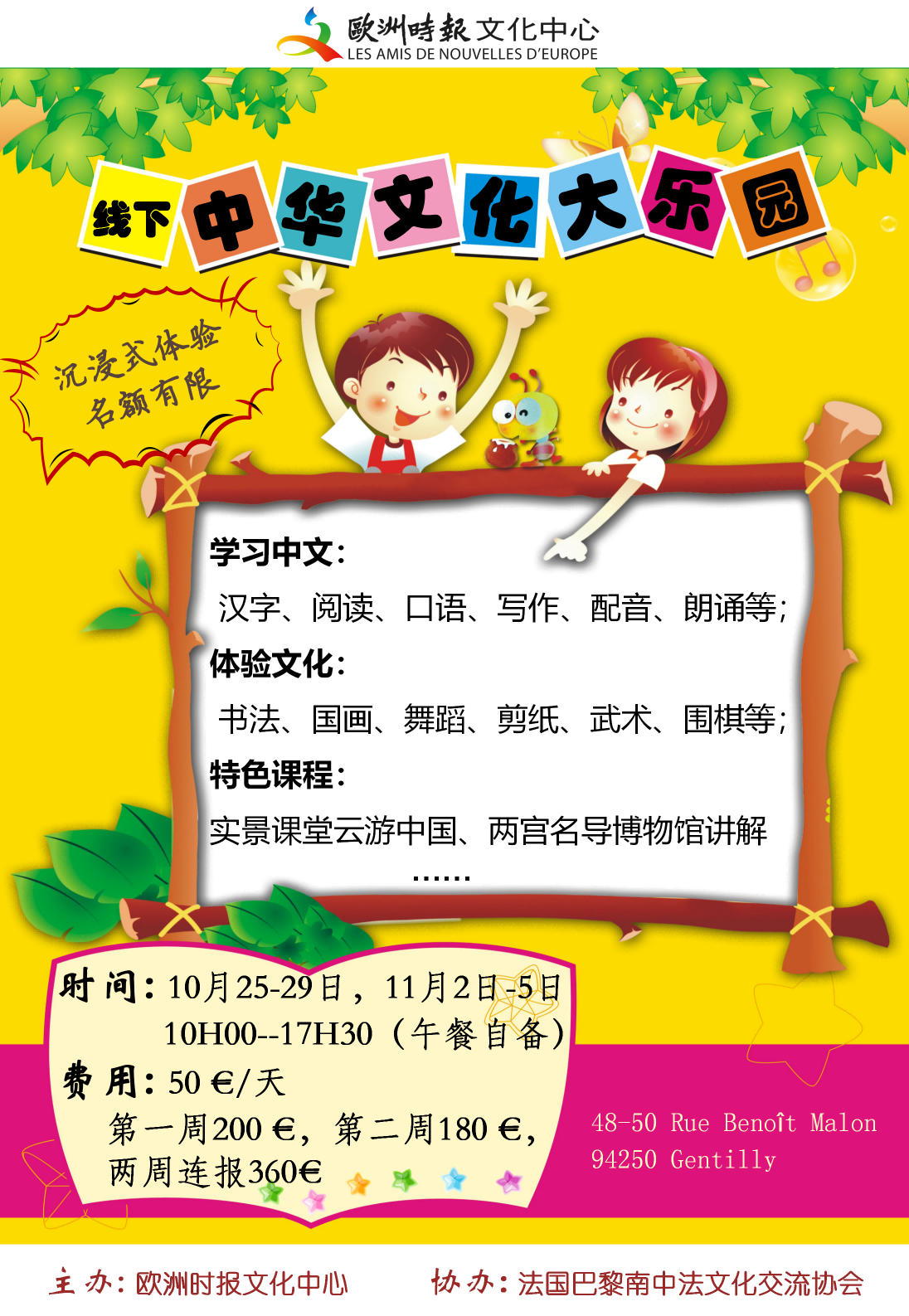由欧洲时报文化中心主办,法国巴黎南中法文化交流协会协办的线下中华文化大乐园将在万圣节假期期间开园。本次文化大乐园首开全日制模式,自上午10点至下午5点30,学员们将沉浸在中文环境中。从早到晚丰富多彩的各类课程,将让学员们在中华文化的乐园里流连忘返。