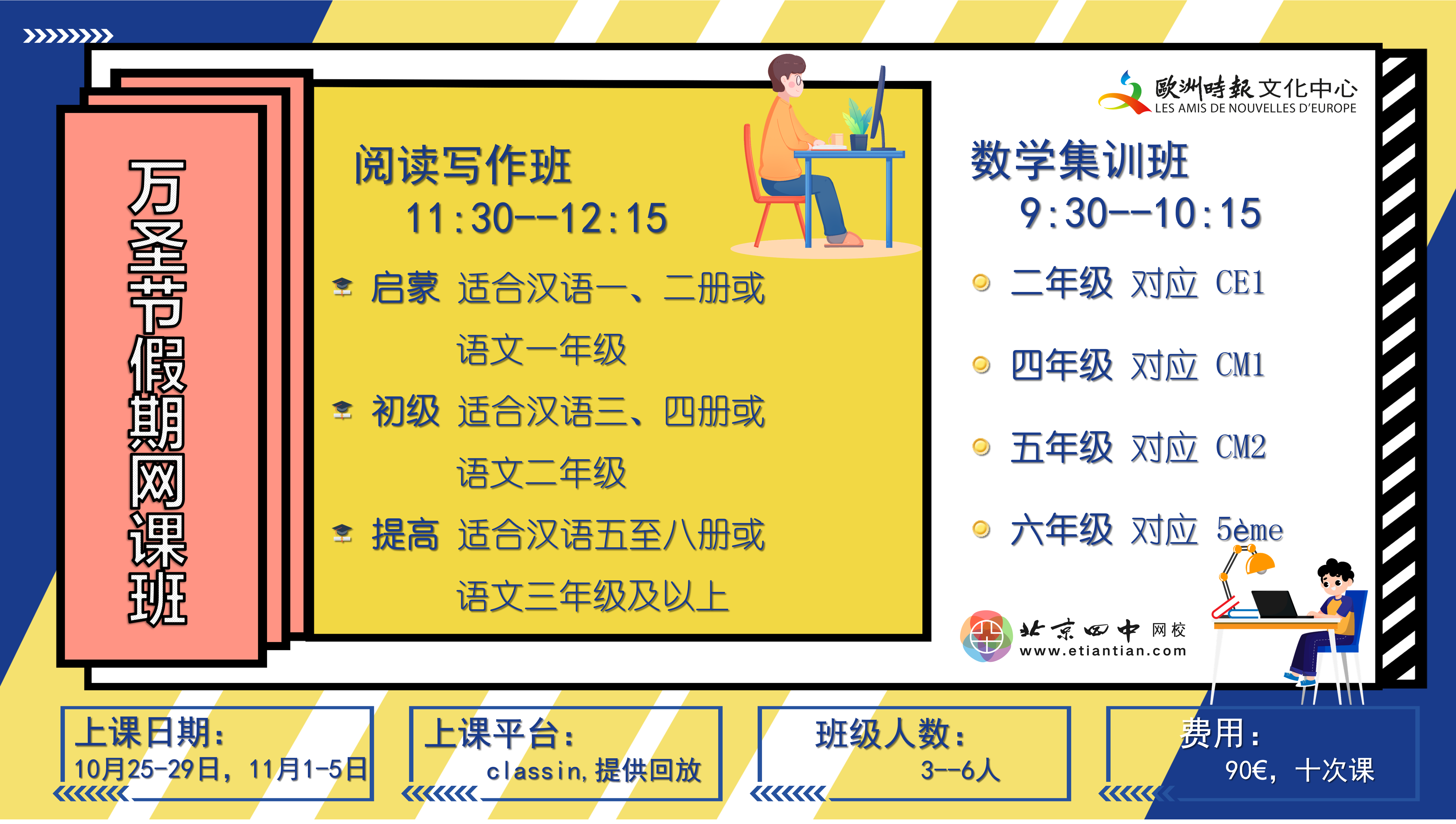 除了线下中华文化大乐园,万圣节学生假期期间,欧洲时报文化中心还和北京四中网校合作,开设了万圣节假期网课班。除了上学年学生假期中备受大家喜爱的数学集训课,此次新增了呼声极高的阅读写作课。