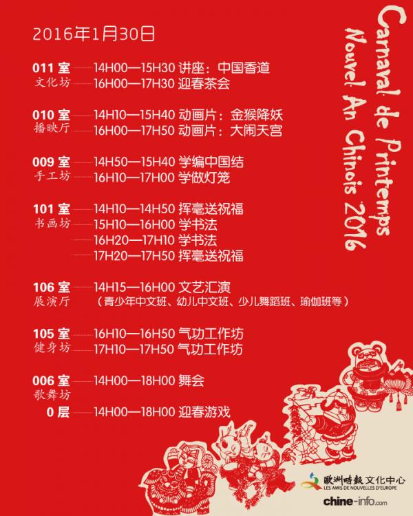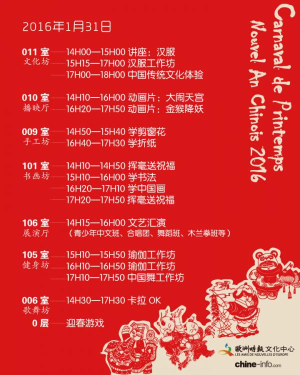 为了迎接猴年新春的到来,“欧洲时报文化中心”联手欧洲时报旗下法语网站chine-info,精心筹备了精彩纷呈的“2016迎春嘉年华”,除了写福字、剪窗花等中国春节传统活动,还有品香道、穿汉服等在中国都很少见的传统文化体验之旅,更有齐天大圣孙悟空驾着筋斗云,与您共欢庆。