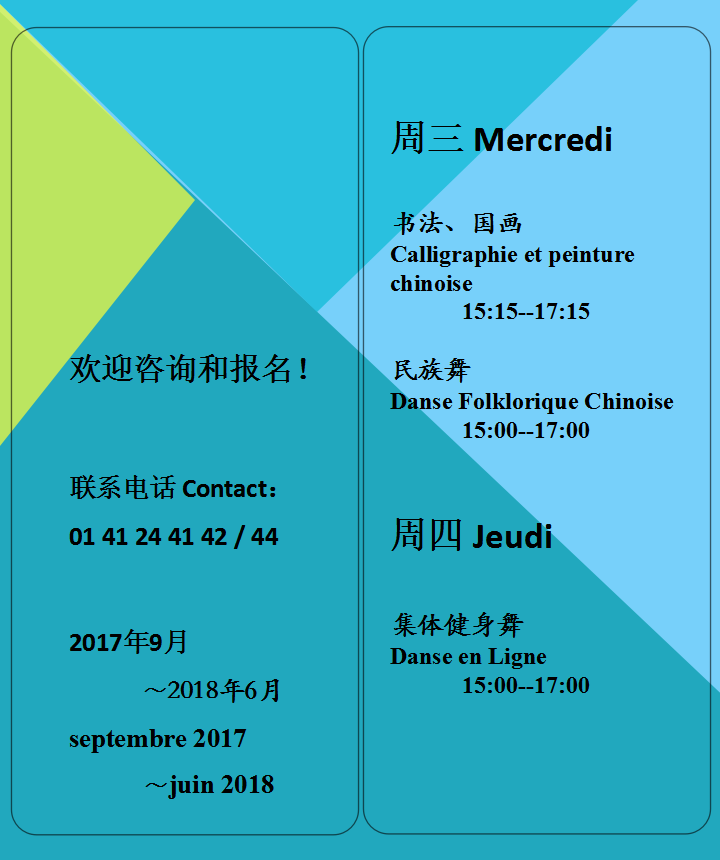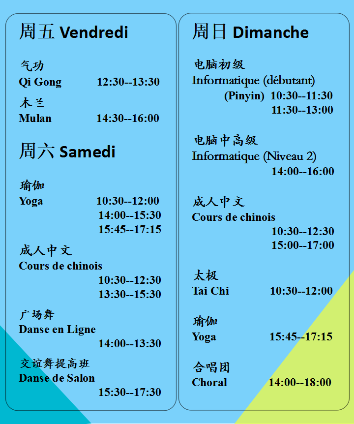 另外中心还设立了法文授课的气功 和木兰拳 ,他们都是一种以呼吸的调整、身体活动的调整和意识的调整为手段,以强身健体、防病治病、健身延年、开发潜能为目的的一种身心锻炼方法。