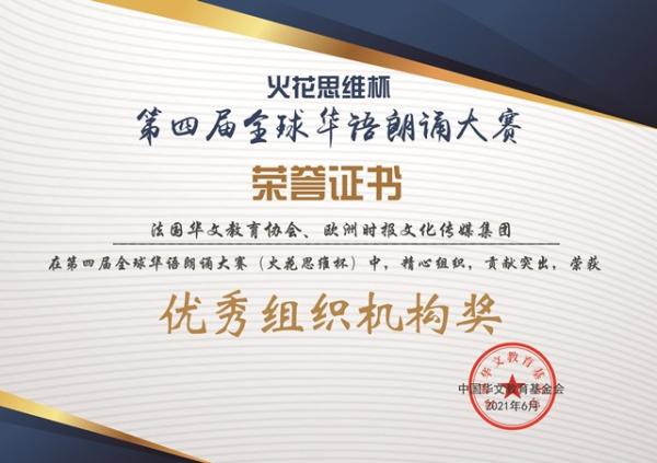 法国共获金奖1名、银奖6名、单项奖(最具潜质奖)1名,优秀奖61名,1位老师荣获优秀指导奖。同时,法国华文教育协会和欧洲时报文化传媒集团荣获优秀组织机构奖!